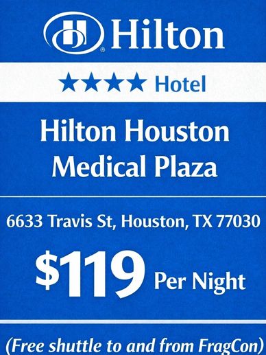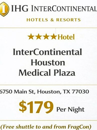 All official FragCon room blocks are secured at four-star hotel properties, intentionally selected to provide comfort, convenience, and a premium attendee experience. Accommodations include InterContinental Houston Medical Center, Marriott Houston Medical Center, and Hilton Houston Plaza / Medical Center, each chosen through careful planning to ensure accessibility and ease for all guests.